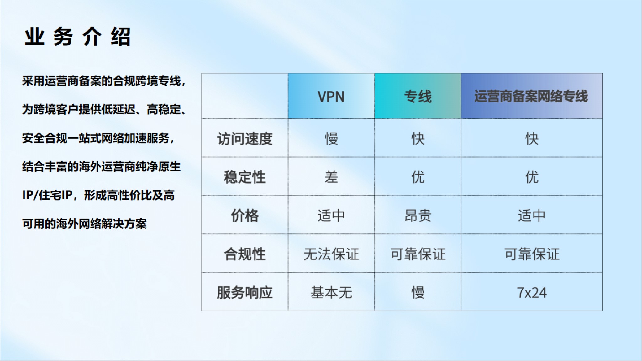 從線路申請、路由優(yōu)化到維護,提供一站式專業(yè)服務(wù),一對一解決問題,專業(yè)營銷團隊一對一定制服務(wù)